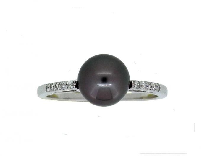 Bague fine en or blanc 18 carats sertie de diamants et surmontée d'une perle de tahiti.