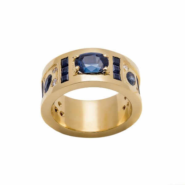 Bague originale en or jaune 18 carats sertie de plusieurs saphirs (1.80 carats) ainsi que de 0.20 carats de diamants.