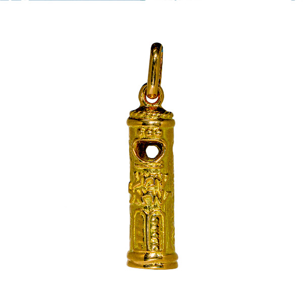 Pendentif mezouzah en or 18 carats pesant 5,25 grammes avec motifs religieux, en particulier une représentation des tables de la loi et des motifs végétaux.